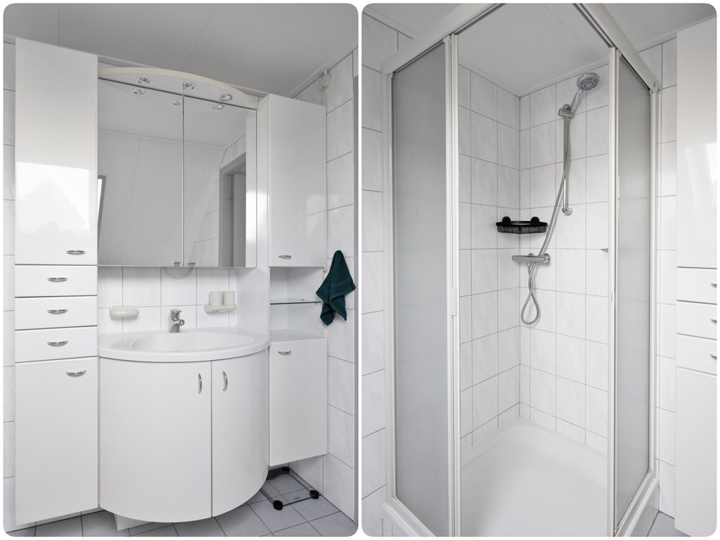 De overloop geeft toegang tot de 3 slaapkamers en een 2e badkamer met 2e toilet, douche en wastafel met meubel. Er is ook nog een berging waar zich ook de cv-installatie bevindt.
