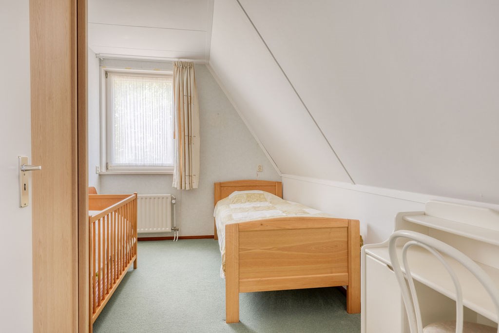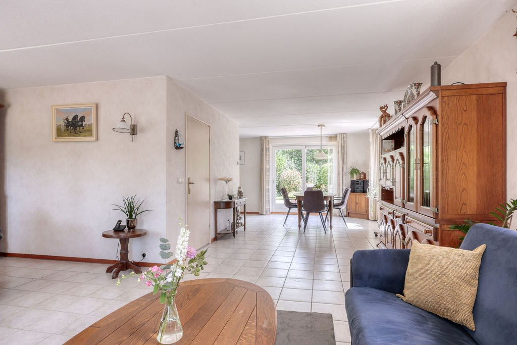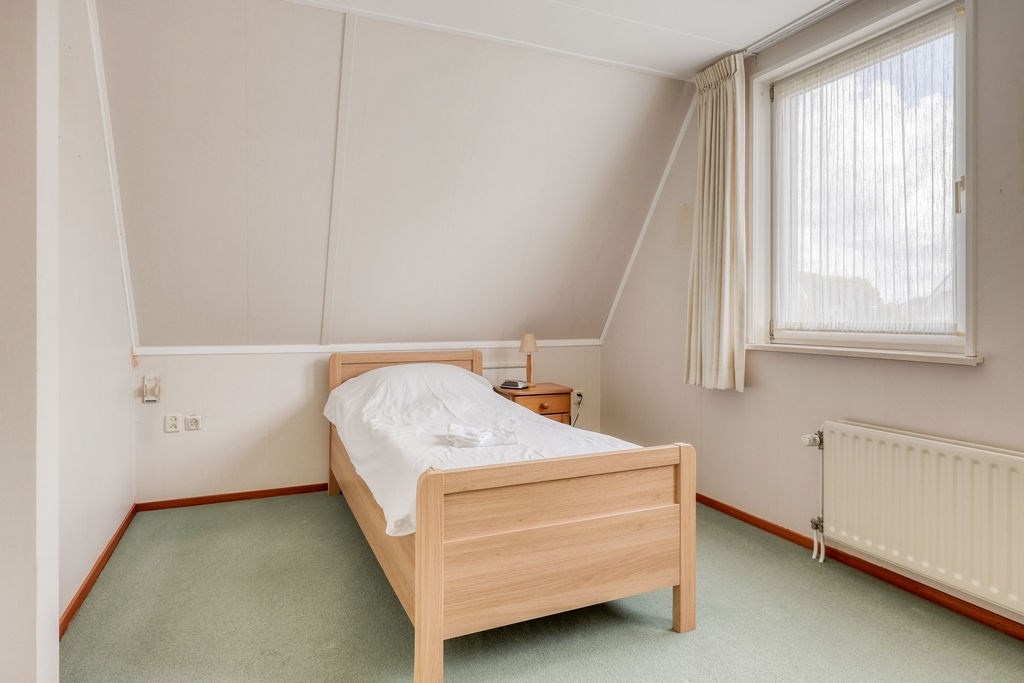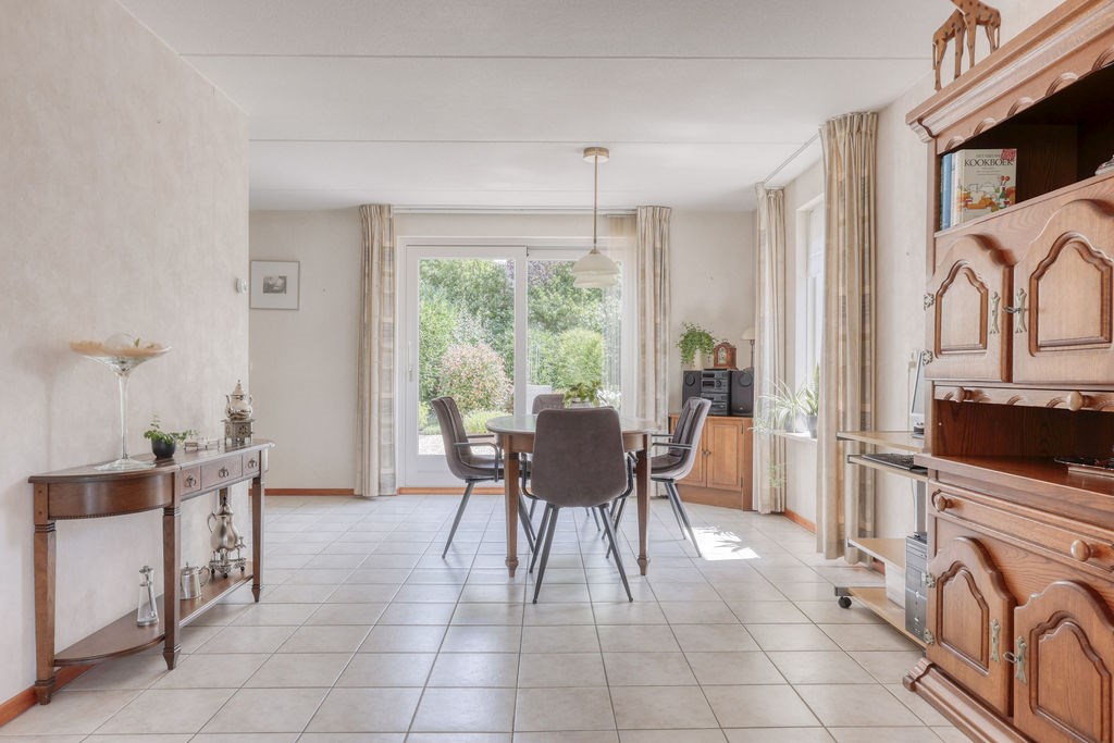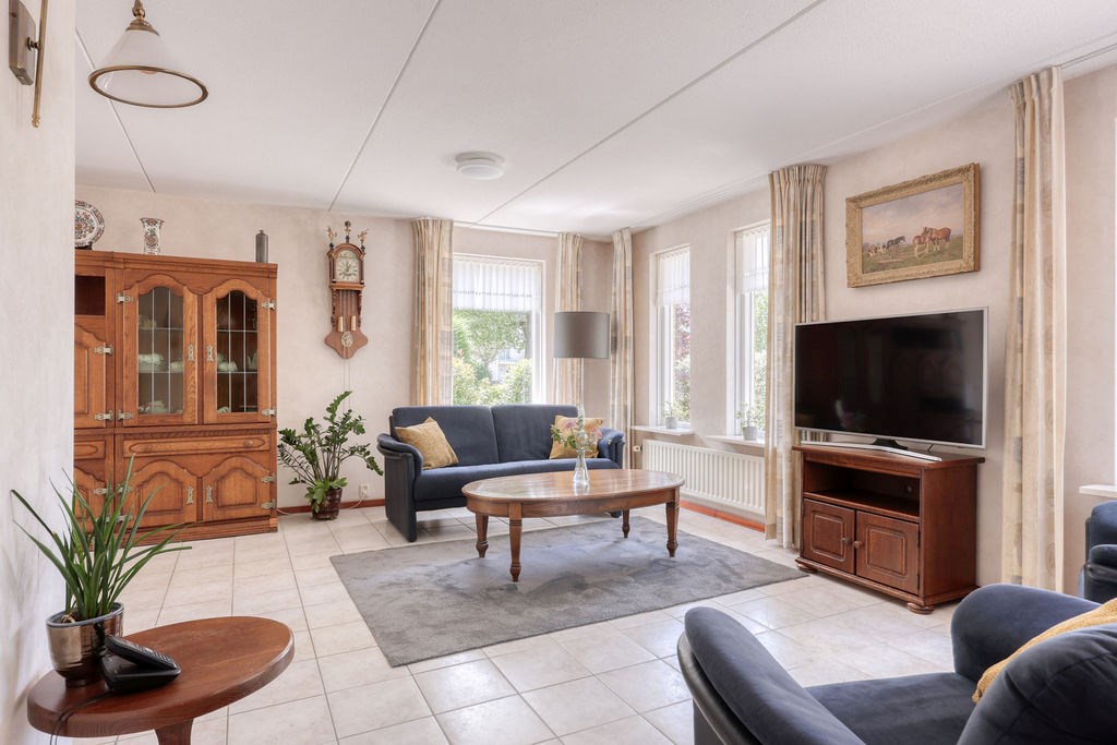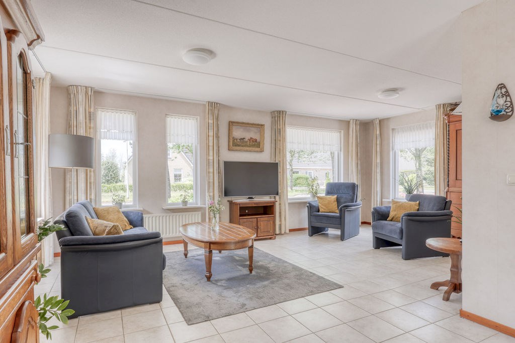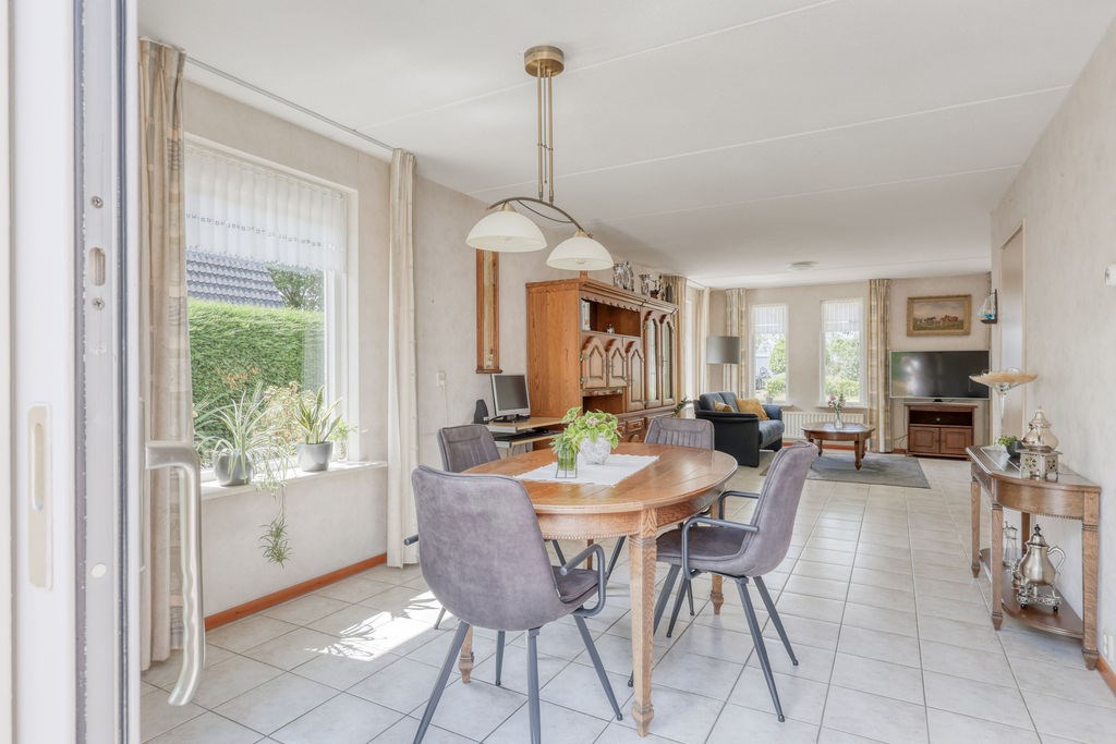 We parkeren de auto op eigen erf in deze ruim opgezette straat met voornamelijk royale vrijstaande huizen. We betreden de woning aan de zijkant en komen in de hal met trapopgang en toilet, via de hal komen we in de ruime L-vormige woonkamer met aan de achterzijde een schuifpui die toegang geeft tot de achtertuin op het zuidoosten. De keuken is open en hier staat een rechte keukenopstelling met losse wandkast, de keuken is voorzien van diverse inbouwapparatuur zoals; koelkast, oven, keramische kookplaat en afzuigkap. Achter de keuken bevindt zich de bijkeuken met aansluiting voor de wasmachine en droger, vanuit de bijkeuken is er toegang tot de voormalige garage waar zich nu een slaapkamer met eigen badkamer, met douche en wastafelmeubel bevindt. Vanuit de slaapkamer is er tevens toegang tot de tuin.