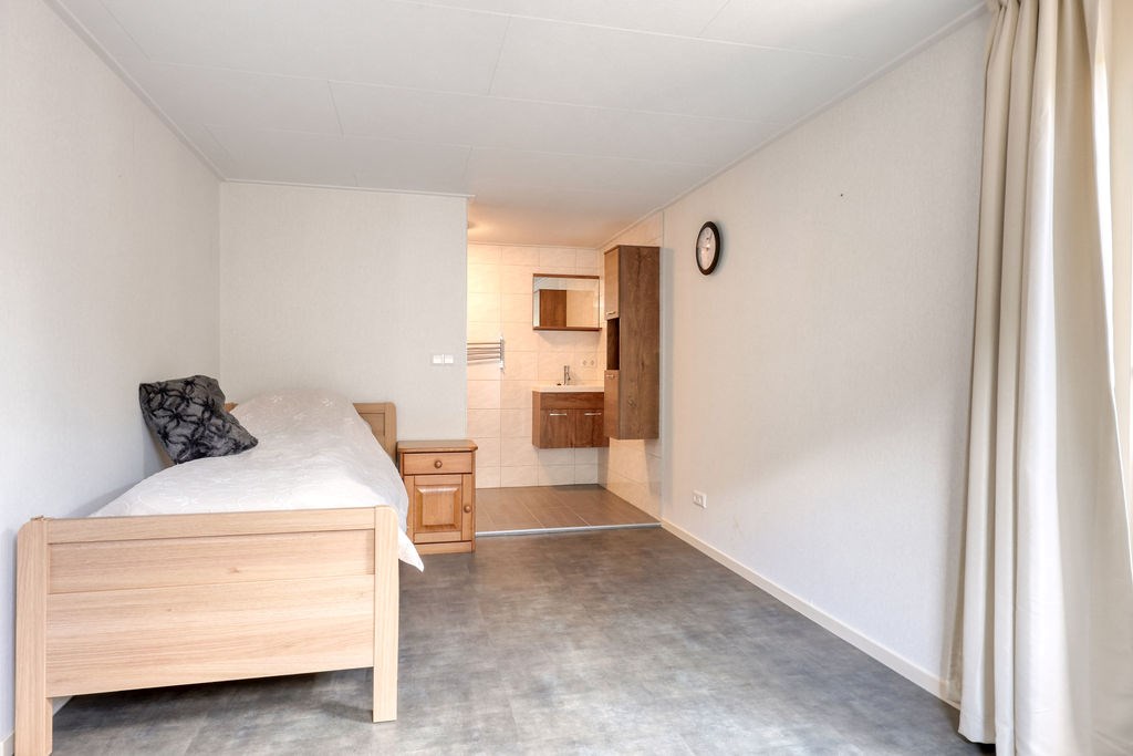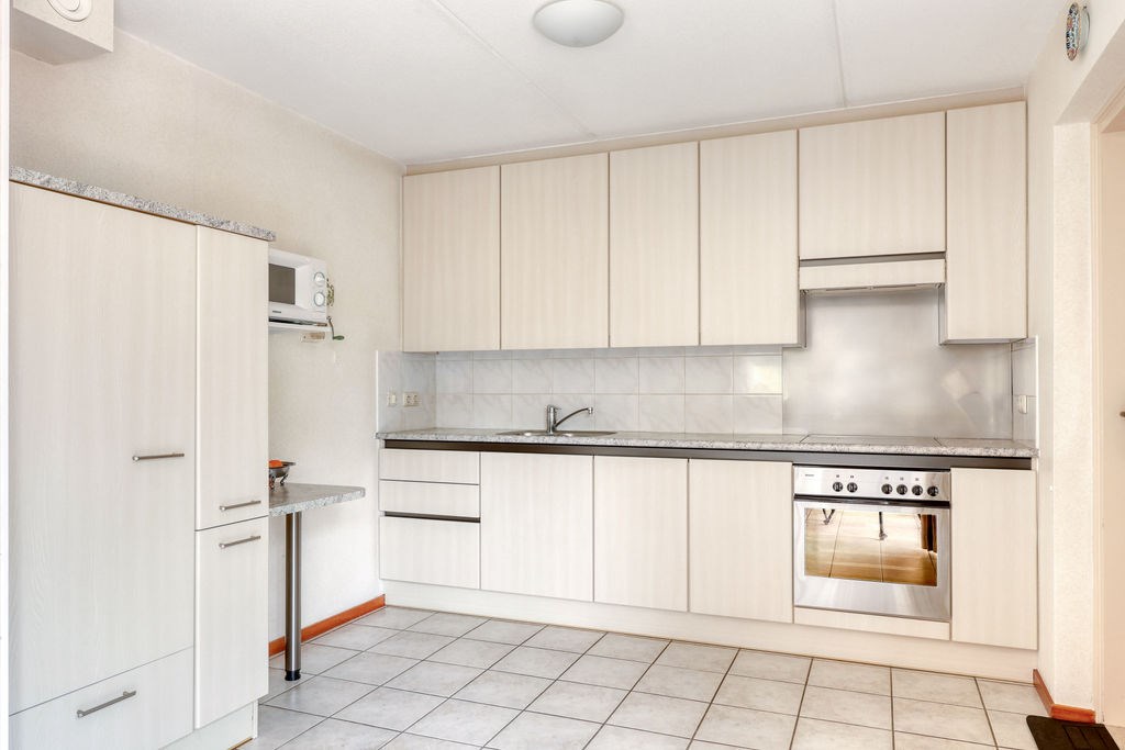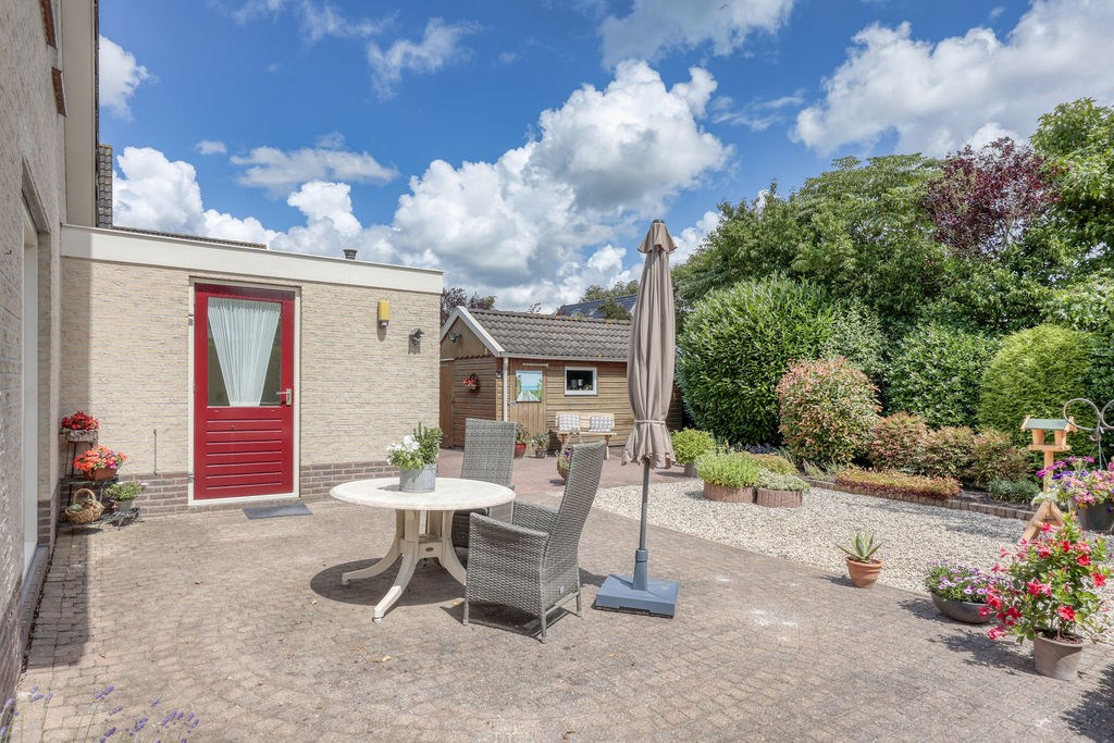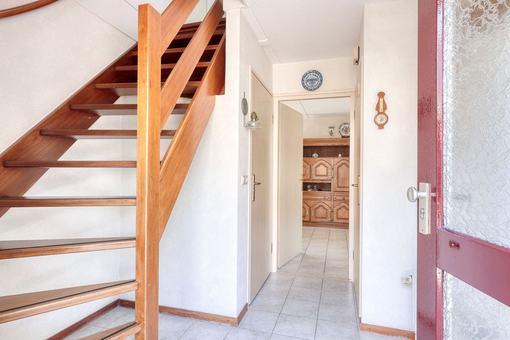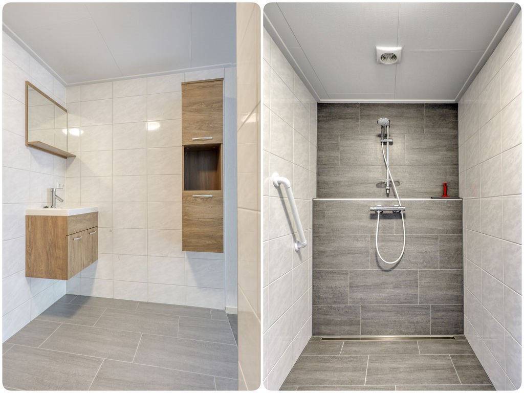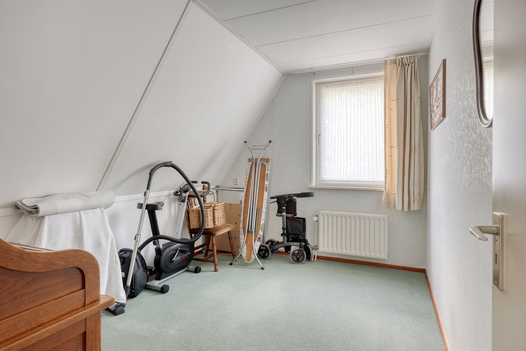We parkeren de auto op eigen erf in deze ruim opgezette straat met voornamelijk royale vrijstaande huizen. We betreden de woning aan de zijkant en komen in de hal met trapopgang en toilet, via de hal komen we in de ruime L-vormige woonkamer met aan de achterzijde een schuifpui die toegang geeft tot de achtertuin op het zuidoosten. De keuken is open en hier staat een rechte keukenopstelling met losse wandkast, de keuken is voorzien van diverse inbouwapparatuur zoals; koelkast, oven, keramische kookplaat en afzuigkap. Achter de keuken bevindt zich de bijkeuken met aansluiting voor de wasmachine en droger, vanuit de bijkeuken is er toegang tot de voormalige garage waar zich nu een slaapkamer met eigen badkamer, met douche en wastafelmeubel bevindt. Vanuit de slaapkamer is er tevens toegang tot de tuin.
